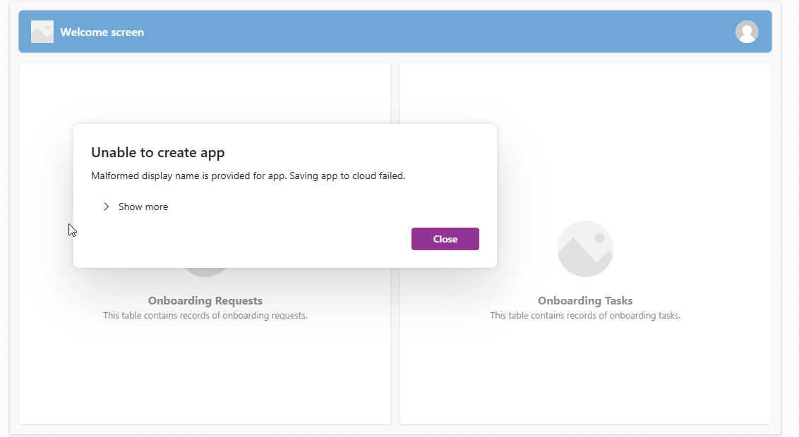 After saving all the user and persona details and data tables, the user is prompted to create and customize the technologies that were added as a part of the new solution. As I tried creating my Dream Corp. – Central app, this error below displayed, so to remedy this I changed the app name to Dream Corp Central and it seemed to save and publish just fine.