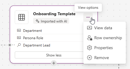 Lastly, one can select the ellipse on a given entity and be presented with a few additional options – View data, Row ownership, Properties, and the ability to remove the entity from the model.