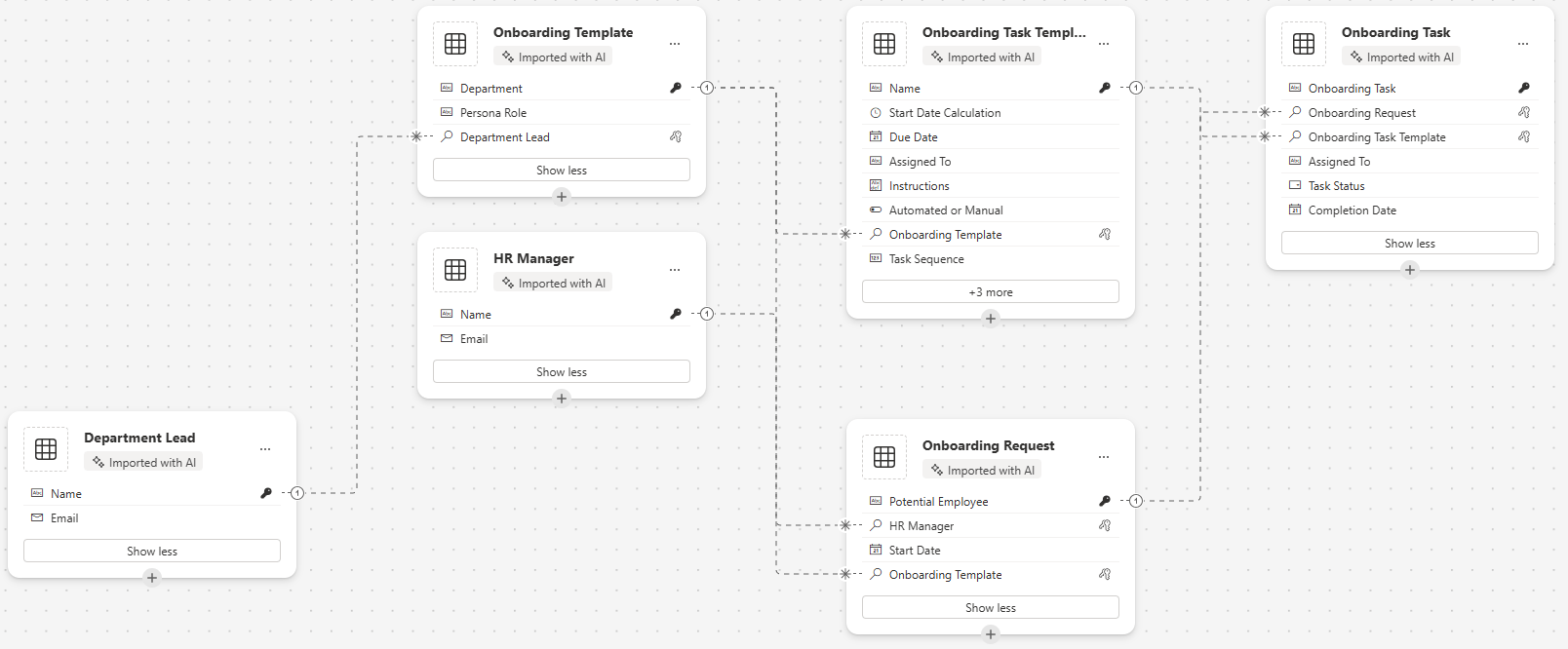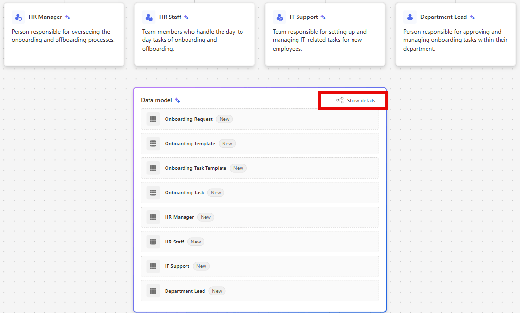 In this example, I used Onboarding Template to click around those additional features. For now, I will remove HR Staff and IT Support entities from my data model so that my model now looks like this before I proceed.