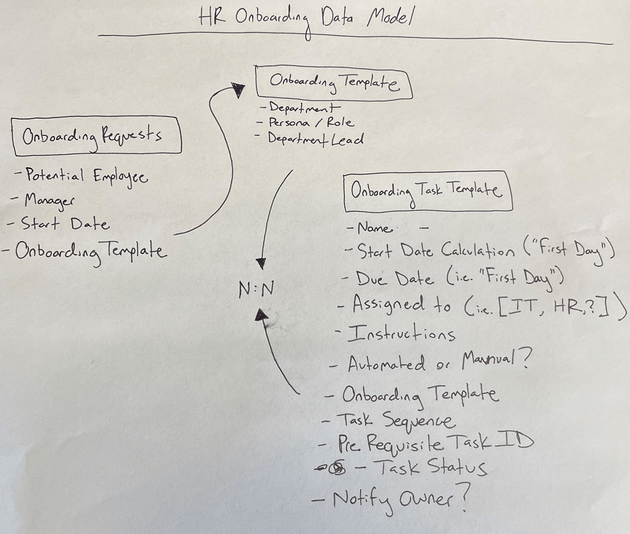 Additionally, I fed the Plan Designer a hand-drawn, rough sketch data model to see what it would spit out. I personally find a lot of value in supplying sketches and whiteboard sessions to the designer, which interestingly enough is how the HR Onboarding solution idea started in the summer of 2023 – shoutout Luke Grindahl.