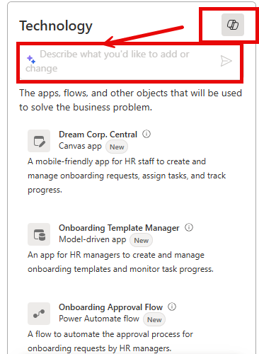 Next, the Plan Designer is generating our Technology layer – these are the Apps (Canvas and/or Model-Driven) and Power Automate Cloud Flows created based on our prompts and data modeling exercises. Below is what was generated based on my steps up to this point: